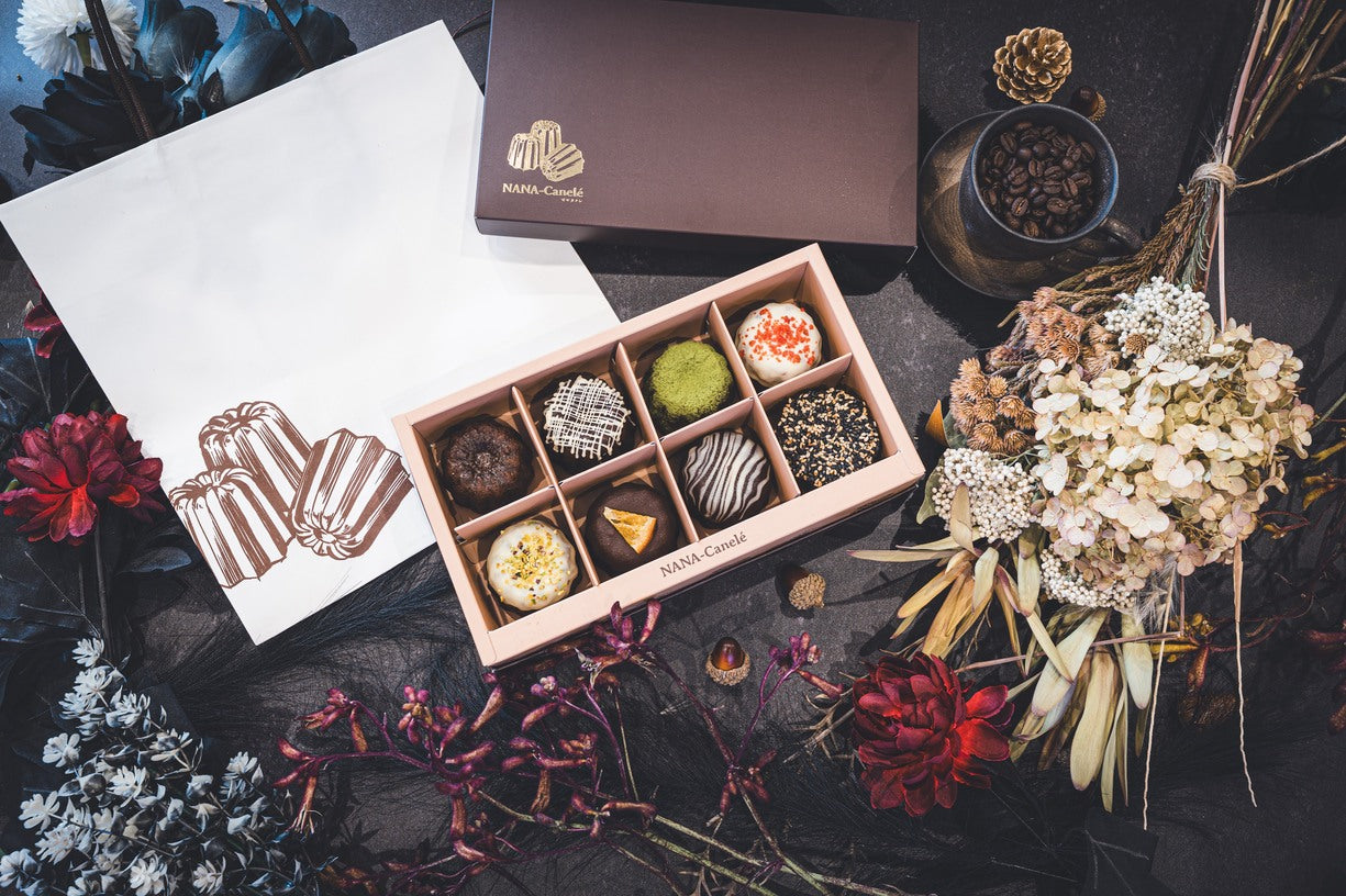 【NANA-Canelé贈答用プレミアム8個入りFセット】 (クラシック、ピスタチオ、ロイヤルミルクティー、オランジェット※、抹茶、ミルクショコラ、いちご、黒胡麻)